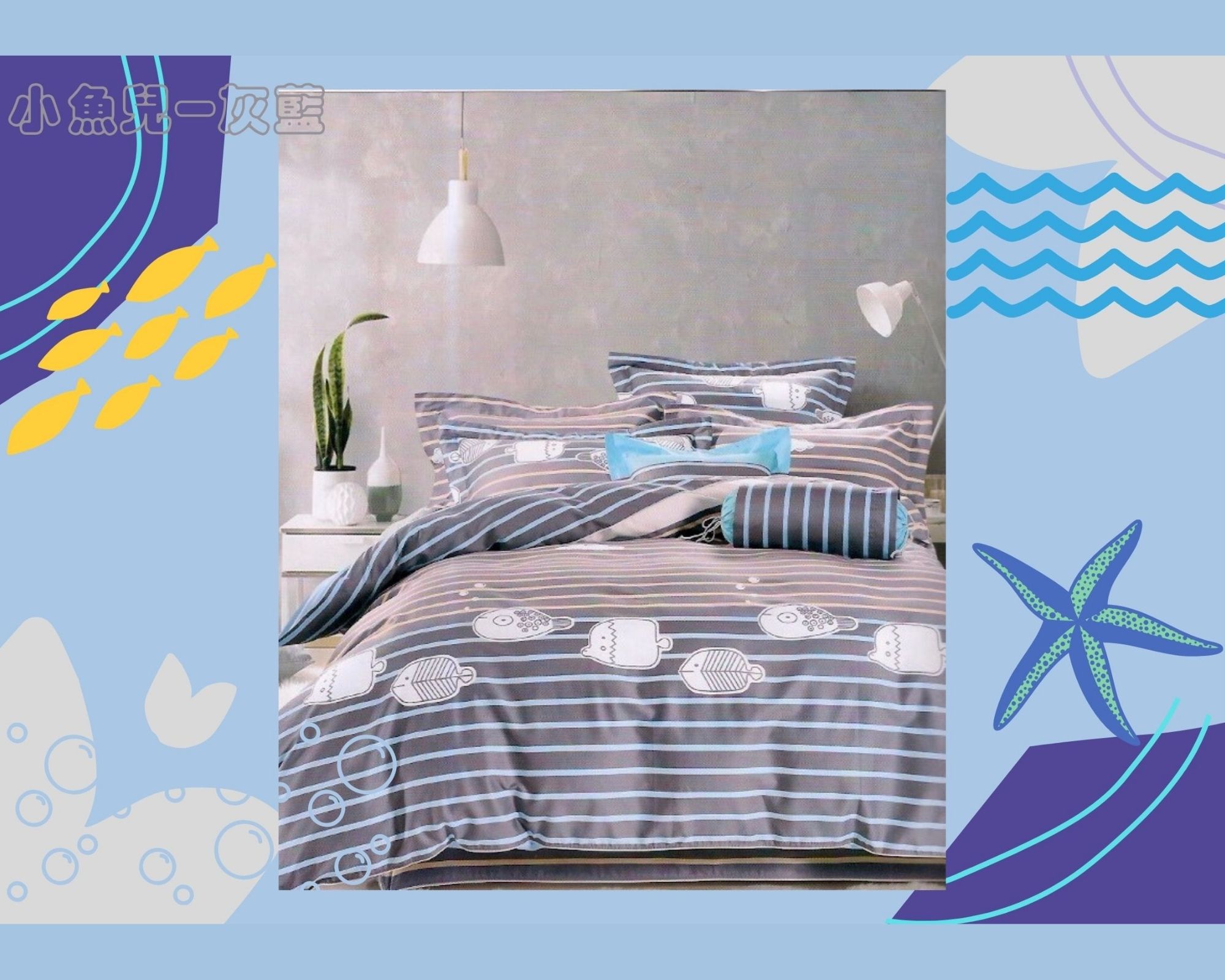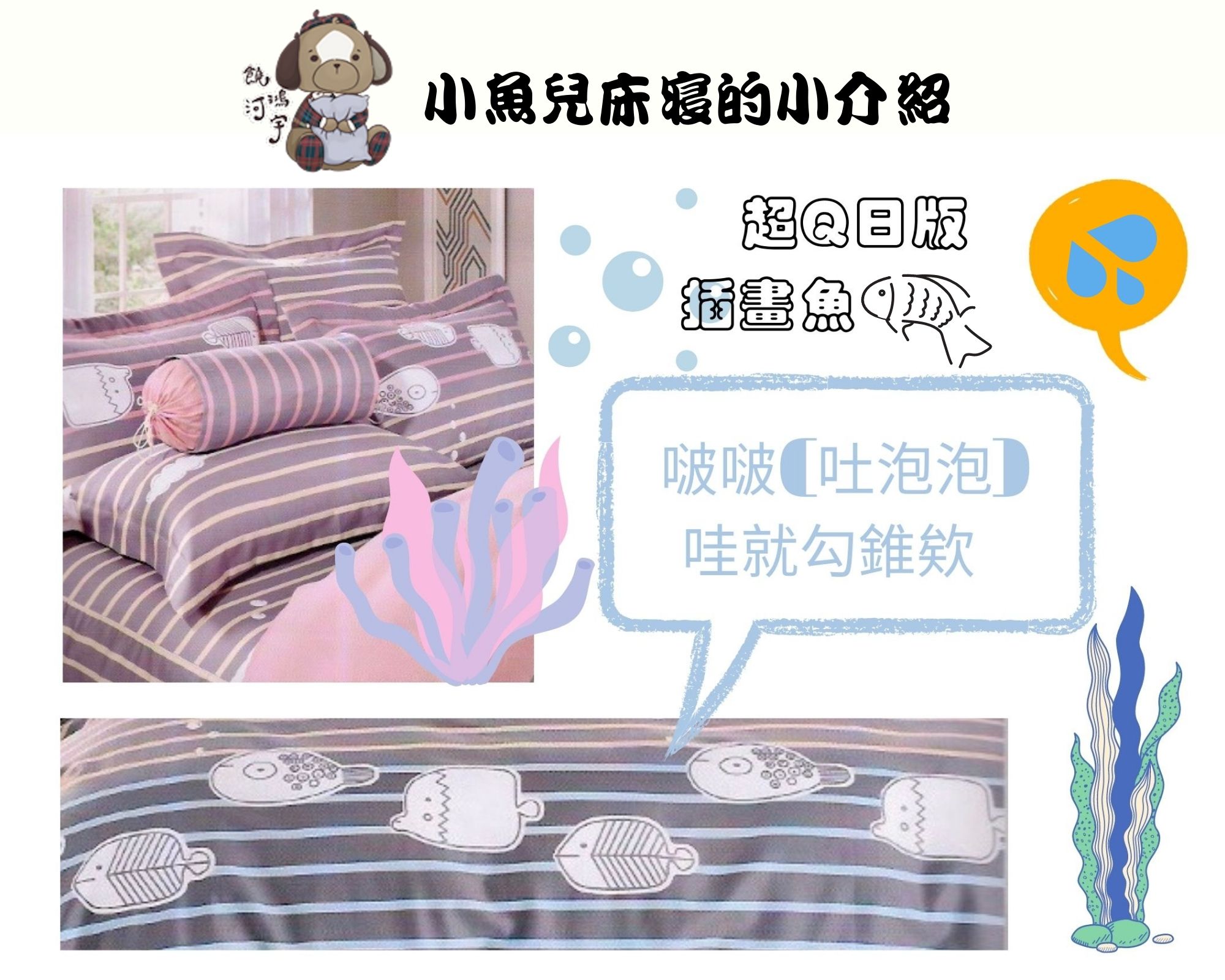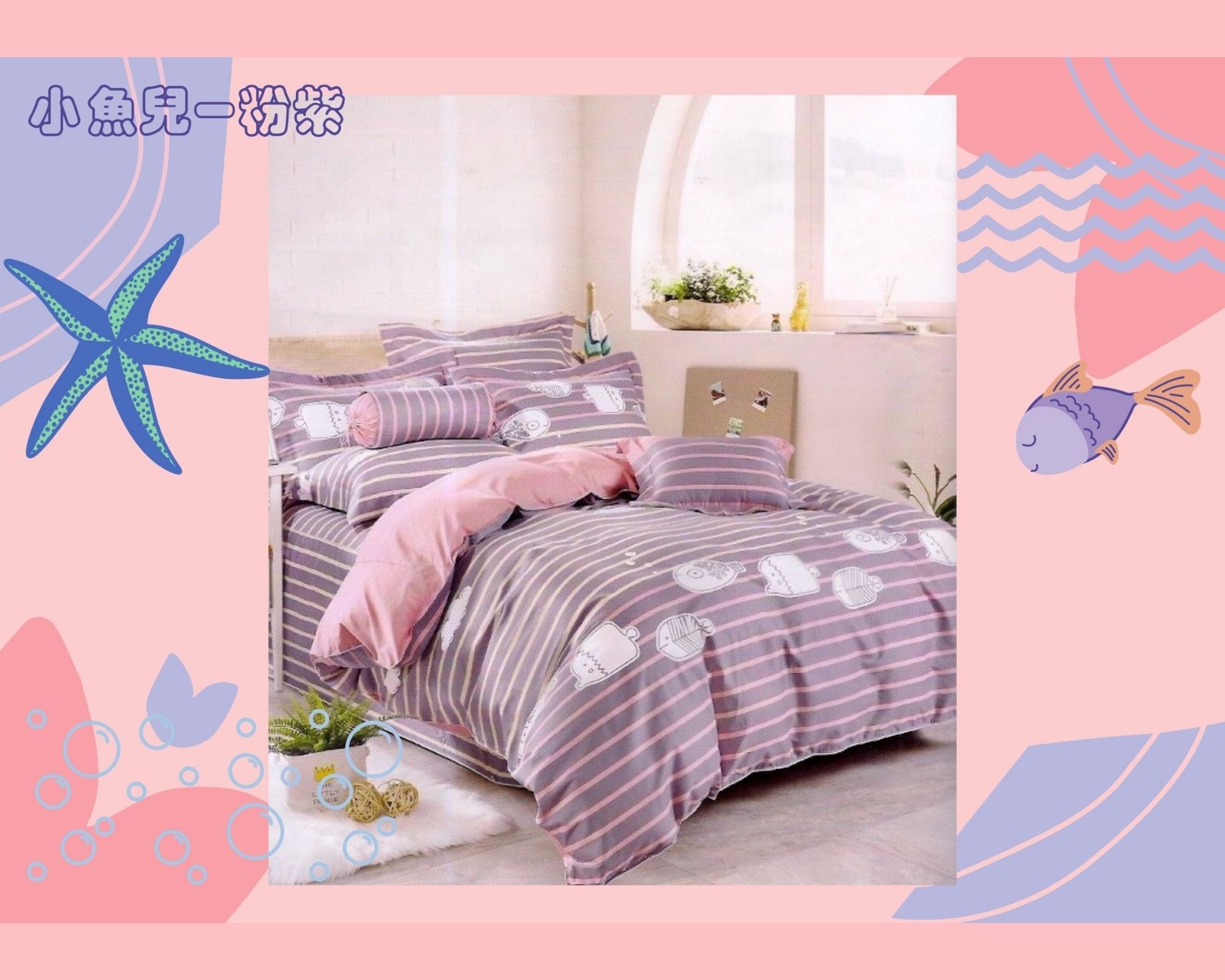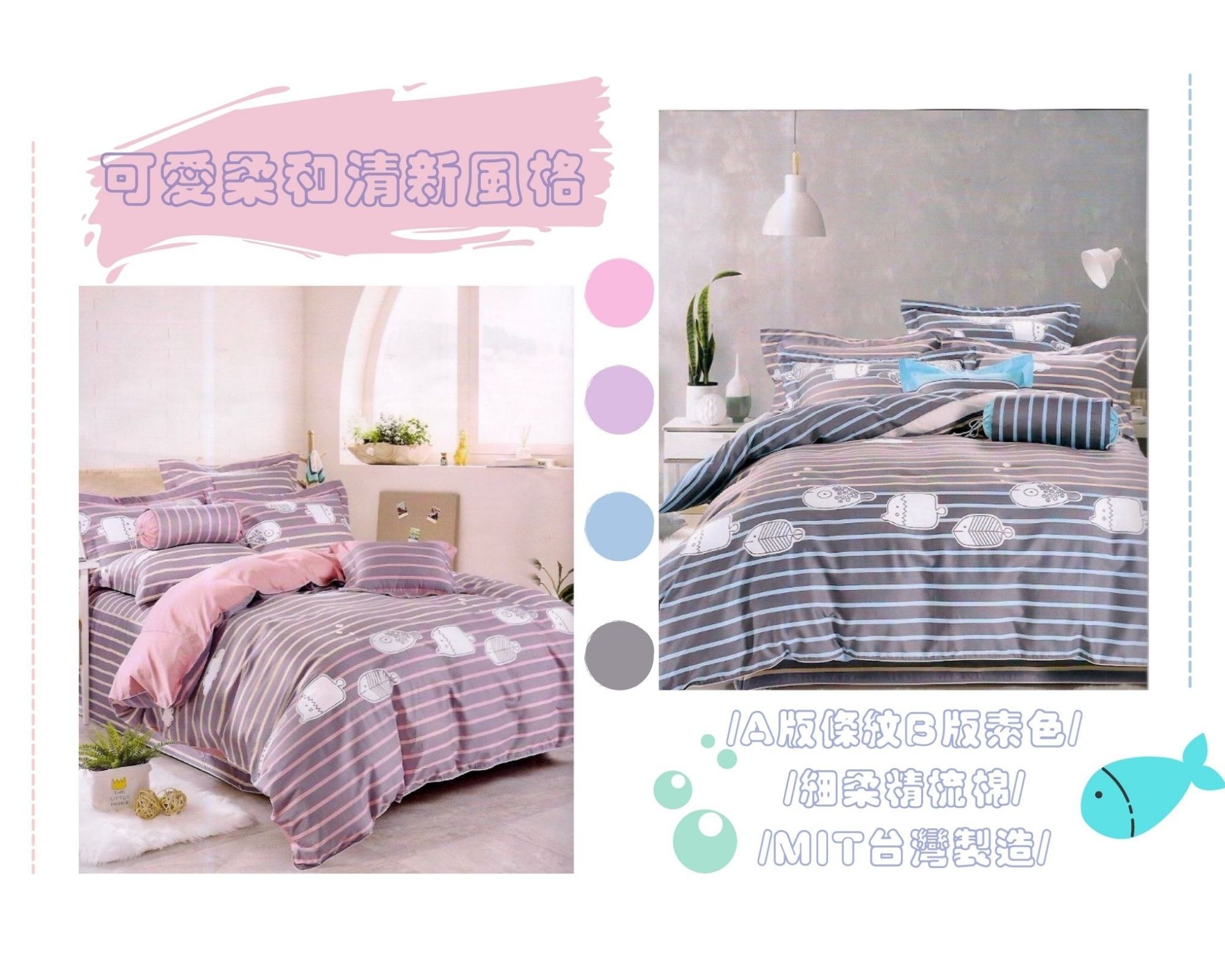 日式Q版插畫魚、淺紫配粉色條紋、細緻精梳棉